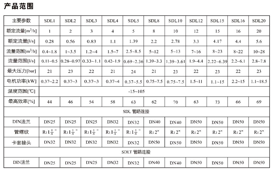 SDL2/SDLT2是一種多功能產(chǎn)品,可以輸送從自來水到工業(yè)液體的各種不同介質(zhì),適用于不同溫度、流量和壓力范圍。